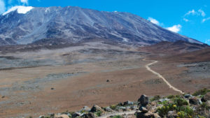 Today your trek will begin in the forest; however you will soon leave this ecosystem behind taking a steep track into a zone of giant heather and volcanic rock. This is a full day ascending through the lush rolling hills below the Shira Plateau. Shira is the third of Kilimanjaro’s volcanic cones. It is filled with the lava flow from Kibo and its rim has eroded and been blasted away by weather and volcanic action. Finally the trail begins to ease as you reach the edge of the plateau. You will camp at Shira One after 5-6 hours of trekking. The view of Kibo from across the plateau is incredible.