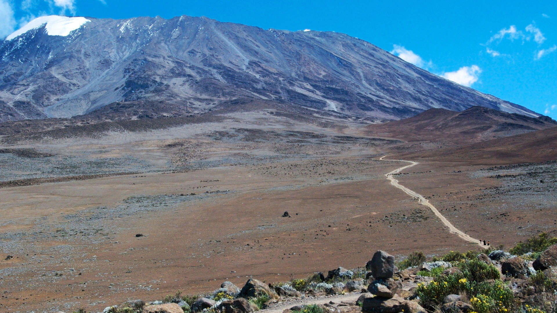 After breakfast, we leave Barranco Camp and begin our climb up the Barranco Wall. This is an impressive scramble where you will be rewarded with fantastic views back towards camp. The porters climbing the wall are also an impressive sight. From the top, at 4,200m, you will follow an undulating path around the mountain side. On a clear day there are spectacular views of Kibo to your left and Mount Meru to your right. After descending into the Karranga Valley your climb takes you through Karranga Camp and steadily on to Barafu. This is located on the ridge below the summit cone. You have now completed the South Circuit, which offers views of the summit from many different angles. At Barafu we make camp, rest, enjoy dinner, and prepare for the summit day. The two peaks of Mawenzi and Kibo can be seen from this position.