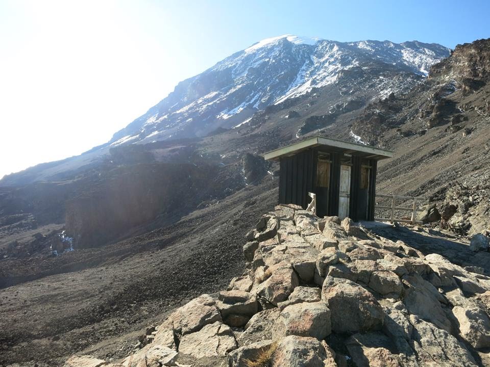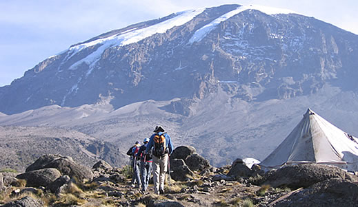 After breakfast, we leave Barranco Camp and begin our climb up the Barranco Wall. This is an impressive scramble where you will be rewarded with fantastic views back towards camp. The porters climbing the wall are also an impressive sight. From the top, at 4,200m, you will follow an undulating path around the mountain side. On a clear day there are spectacular views of Kibo to your left and Mount Meru to your right. After descending into the Karranga Valley your climb takes you through Karranga Camp and steadily on to Barafu. This is located on the ridge below the summit cone. You have now completed the South Circuit, which offers views of the summit from many different angles. At Barafu we make camp, rest, enjoy dinner, and prepare for the summit day. The two peaks of Mawenzi and Kibo can be seen from this position.
